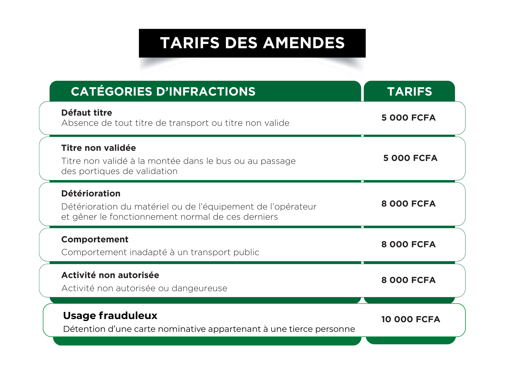 Assurez vous d’avoir un titre de transport valide pour profiter pleinement de votre trajet. Consultez ci-dessous le détail des tarifs des contraventions.