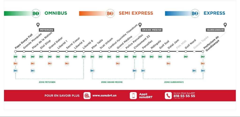 SunuBRT vous propose une large gamme de titres répondant au mieux à vos habitudes de déplacement. Retrouvez toutes les informations sur la gamme tarifaire auprès de nos guichets de vente en station, nos agences commerciales et sur notre site internet www.sunubrt.sn. Le voyage est gratuit pour les enfants accompagnés âgés de moins de 4 ans.